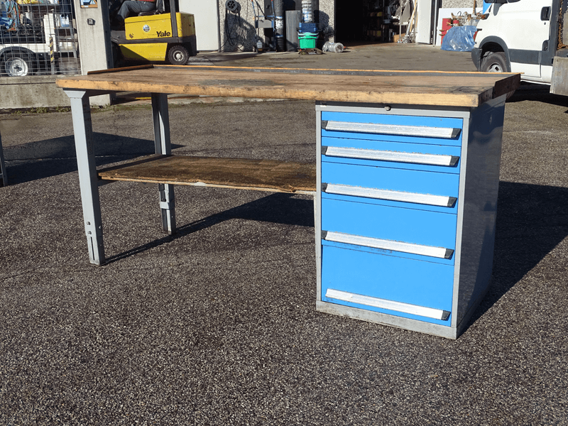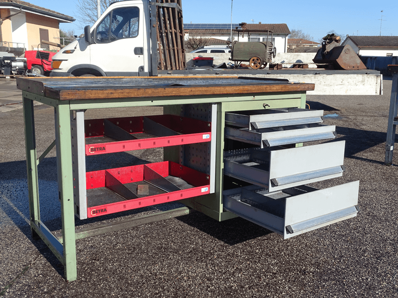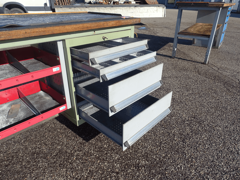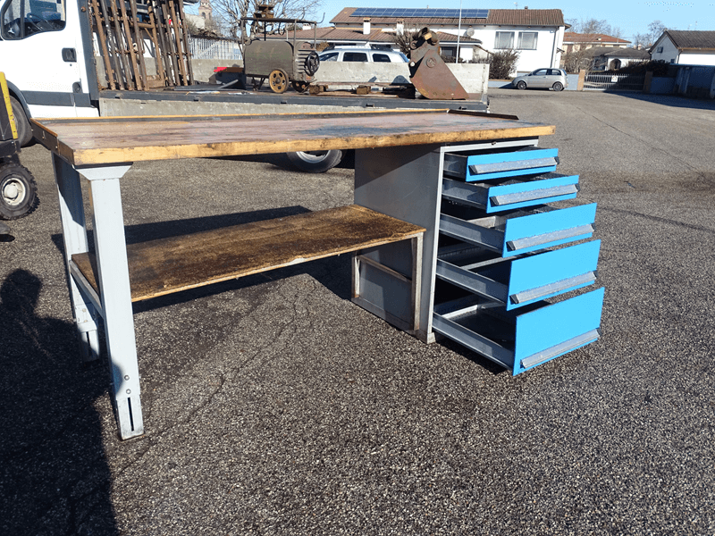 -Tavolo da officina usato con cassettiera su cuscinetti a 4 ripiani